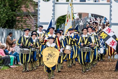 Omdat wij dit unieke uniform hebben worden wij regelmatig uitgenodigd op schuttersfeesten en speciale optochten.